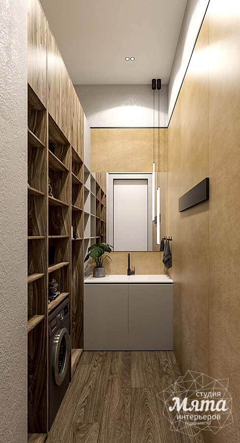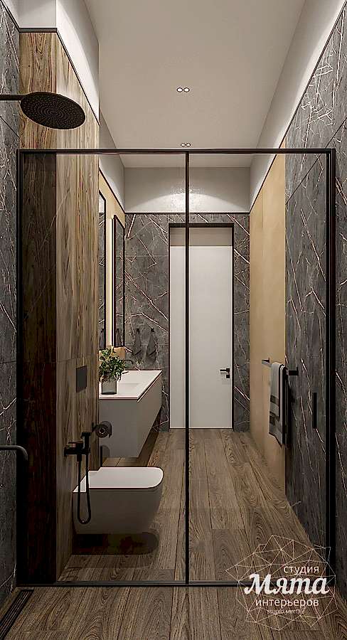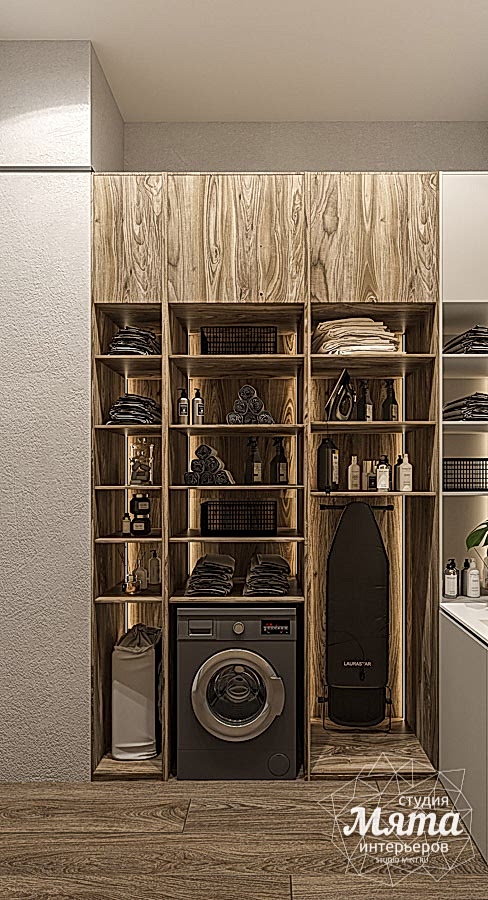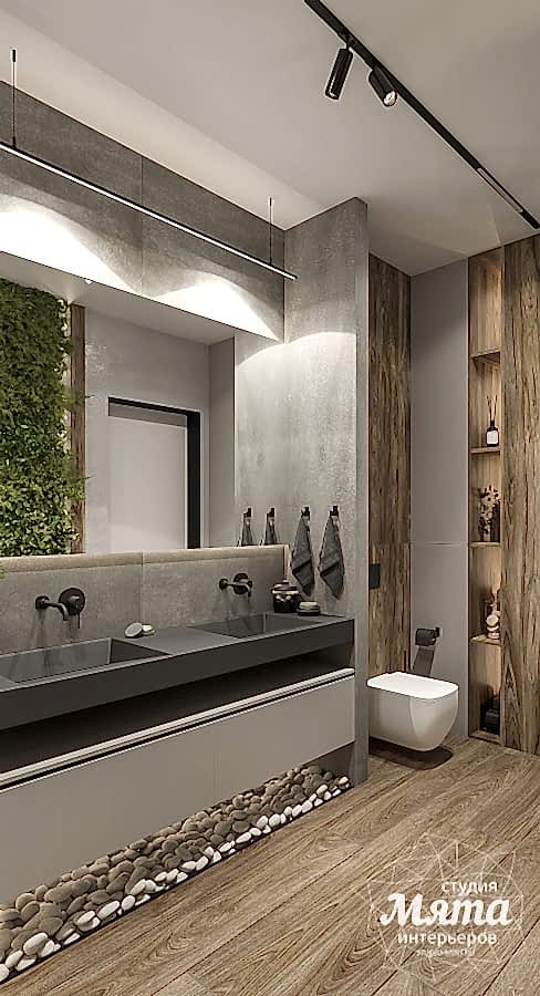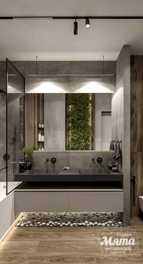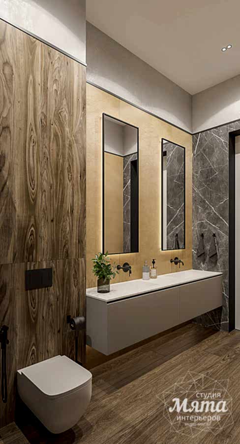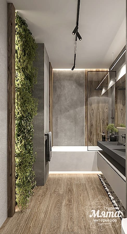 В отделке мы применили качественные, экологически чистые отделочные материалы с износостойкими свойствами. Для напольного покрытия выбрали водостойкий, высокопрочный ламинат в жилых комнатах и керамогранит с имитацией дерева в санузлах и бытовых помещениях. Для отделки стен использовали декоративную штукатурку с ненавязчивой фактурой, а в Pin-Up декоративных элементов выбрали гипсовые рельефные панели, МДФ-панели под дерево и декоративное озеленение, что внесло в интерьер индивидуальность, изюминку и особый уют. Крупноформатный керамогранит с природными оттенками и текстурами идеально вписался в оформление санузлов.