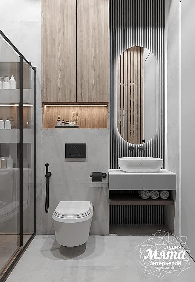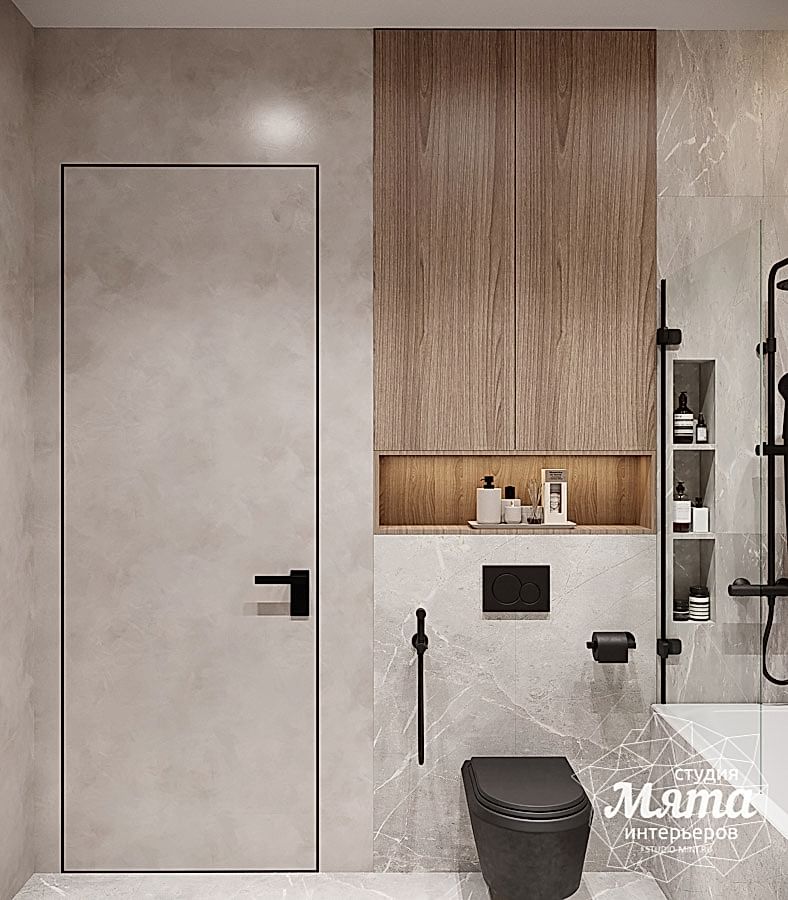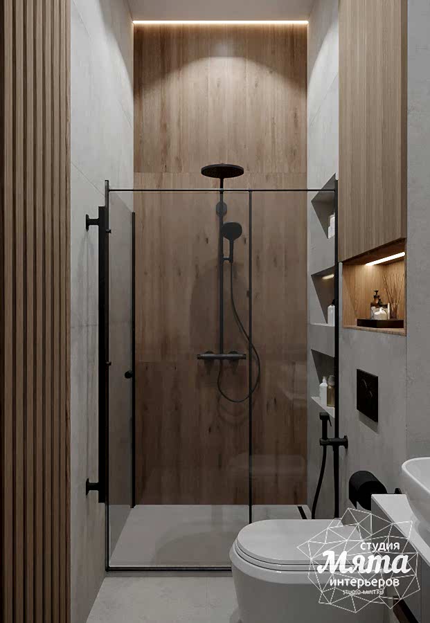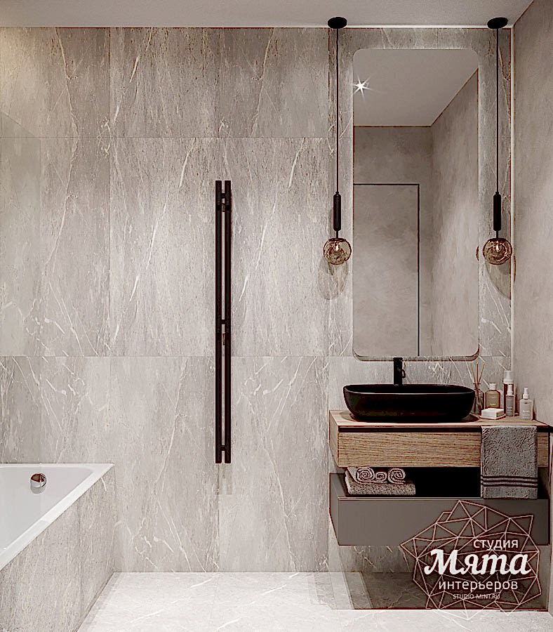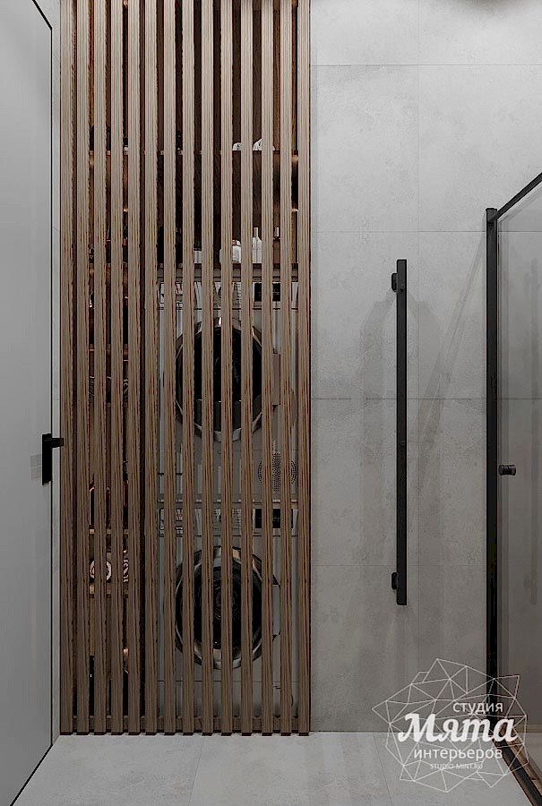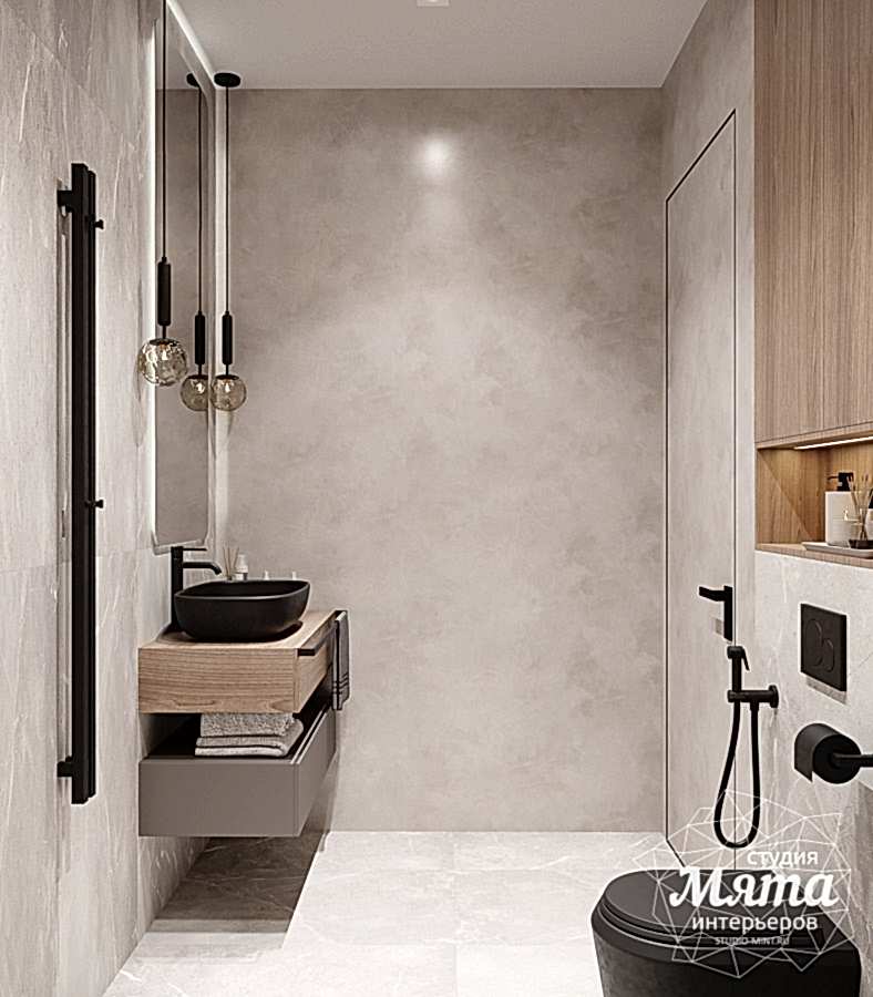 Оба санузла в доме выполнены в спокойной цветовой гамме с элементами под дерево. Заказчики хотели, чтобы в Pin-Up было сочетание керамогранита и другого отделочного материала по стенам, а также черная сантехника. Так, в гостевом санузле дверцы шкафа под стиральную и сушильную машины выполнены в виде реек, в зоне душевой акцентная стена под дерево, а для того, чтобы поддержать рейки шкафа, за зеркалом применена реечная МДФ панель. В ванной комнате второго этажа в мокрых зонах использован керамогранит, в остальных - декоративная штукатурка, вся сантехника черная, в зоне ванны также акцентный керамогранит под дерево. В обоих санузлах применена скрытая подсветка для придания уюта интерьеру.