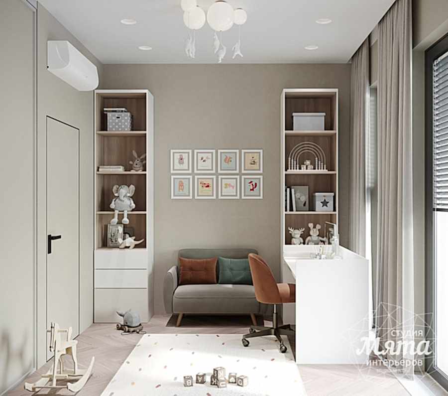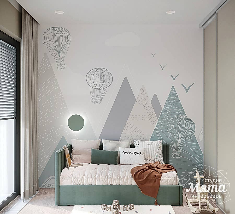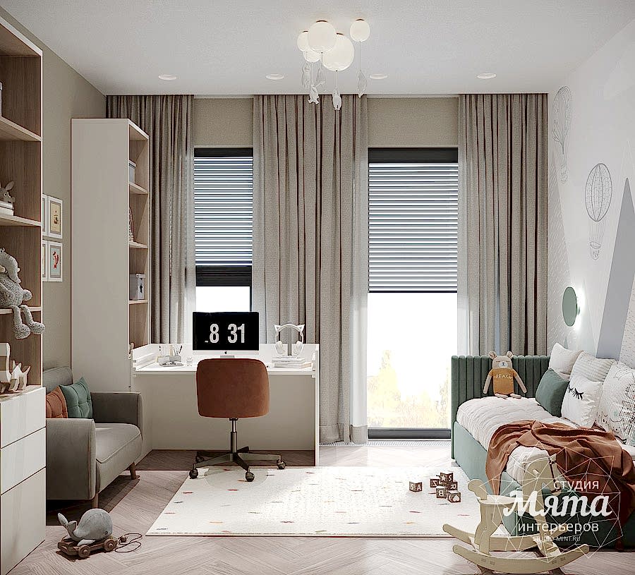 Для отделки детской комнаты были использованы детские обои и Pin-Up люстра в виде мишек и гипсовый бра, под акцентные оттенки общего интерьера. Они придали комнате уюта и тепла. Также в детской удалось разместить отдельную небольшую гардеробную, которая обязательно станет актуальной для подрастающего ребенка.