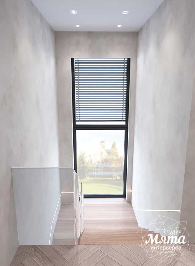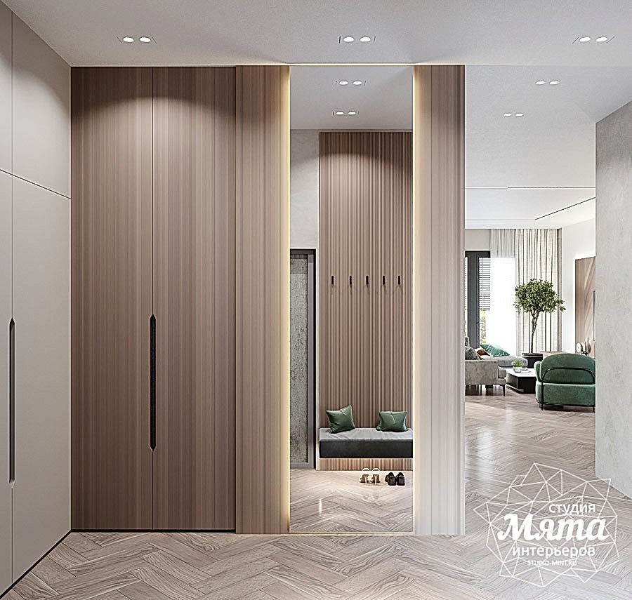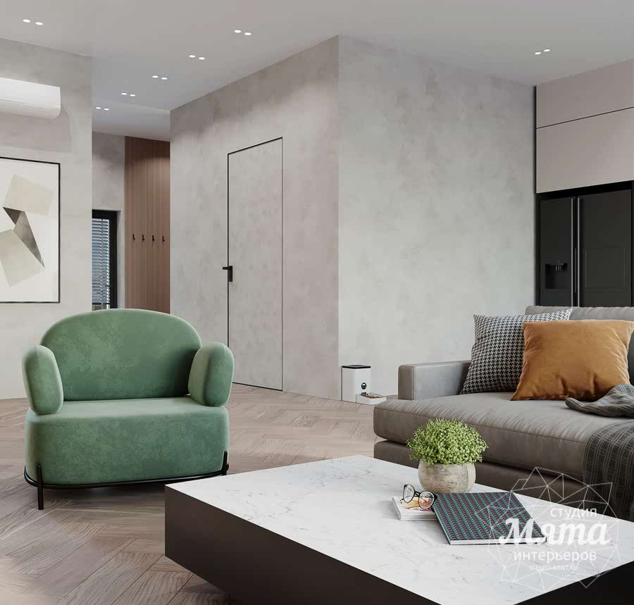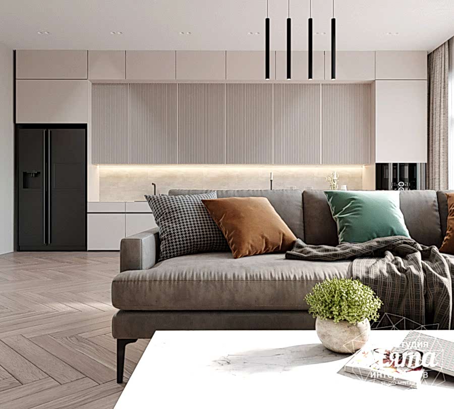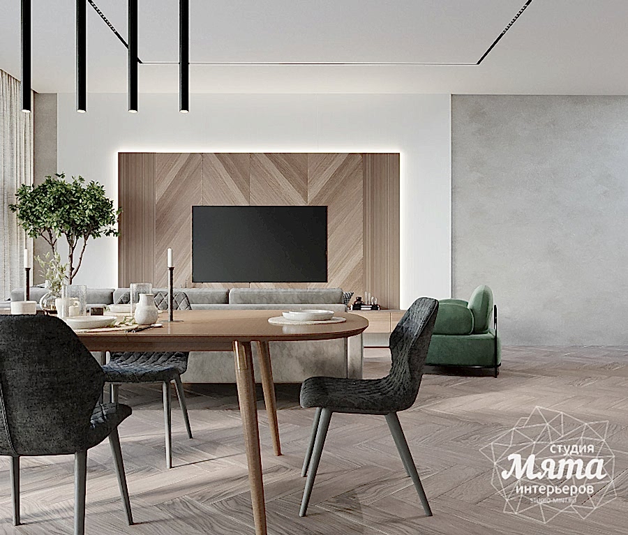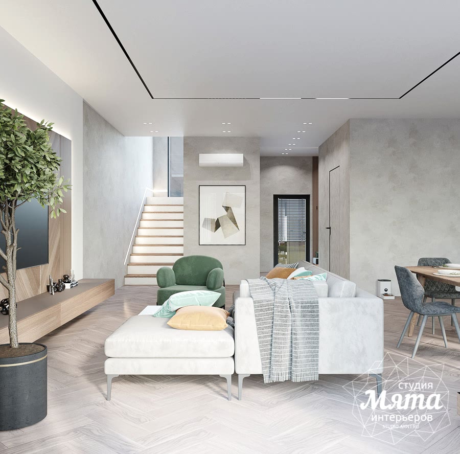 Дизайн интерьера таунхауса в Астане получился в светлых тонах. Акцентными оттенками стали светло-терракотовый и светло-зеленый. Отделка стен и напольное покрытие в общих помещениях, кроме санузлов, единое - тепло-серая декоративная штукатурка и кварцвинил под натуральное дерево. Для поддержания общего стиля были заложены двери скрытого монтажа. В зоне гостиной зона ТВ оформлена дюрополимерными панелями и МДФ панелями под дерево. Реечные панели поддерживаются также вторым рядом кухонных фасадов. А дерево, предложенное в зоне ТВ, перекликается с обеденным Pin-Up