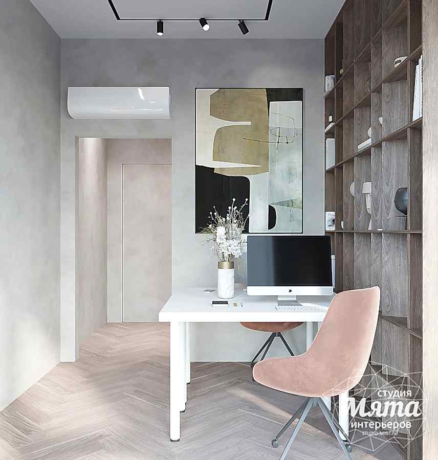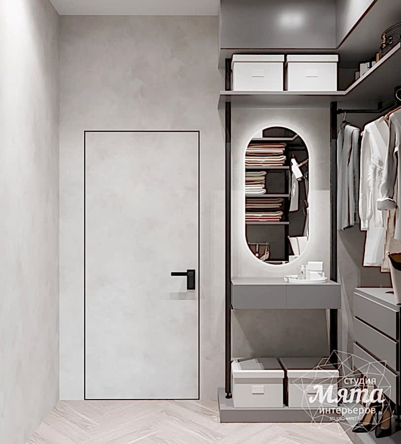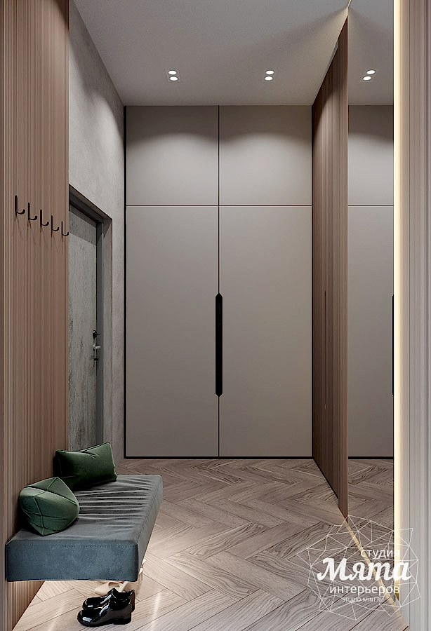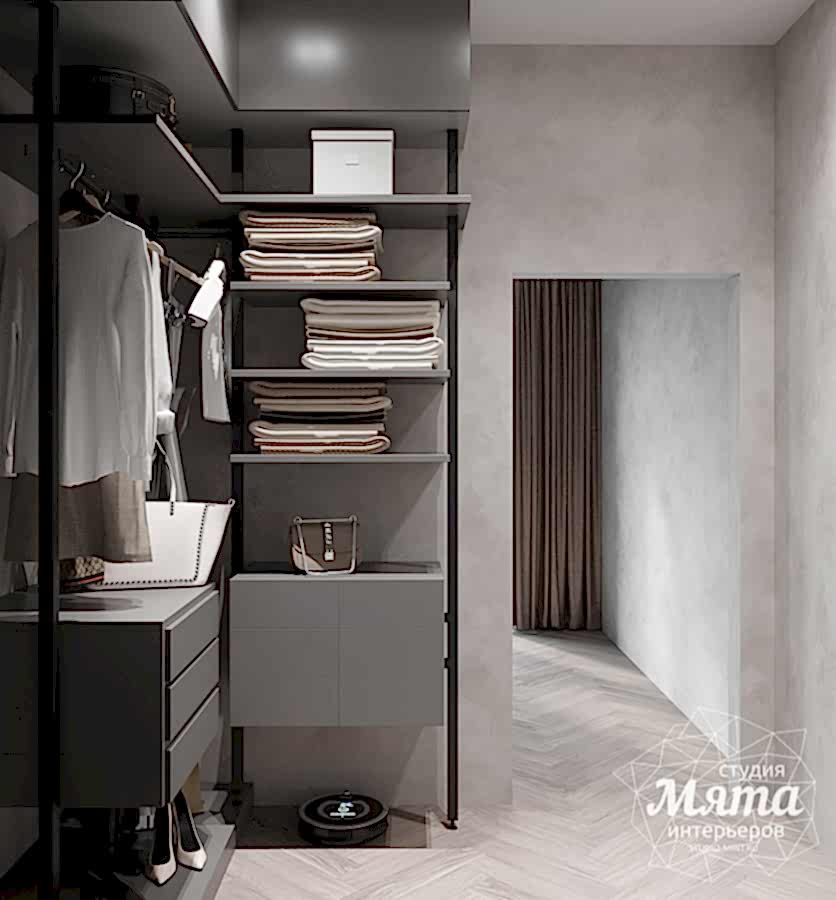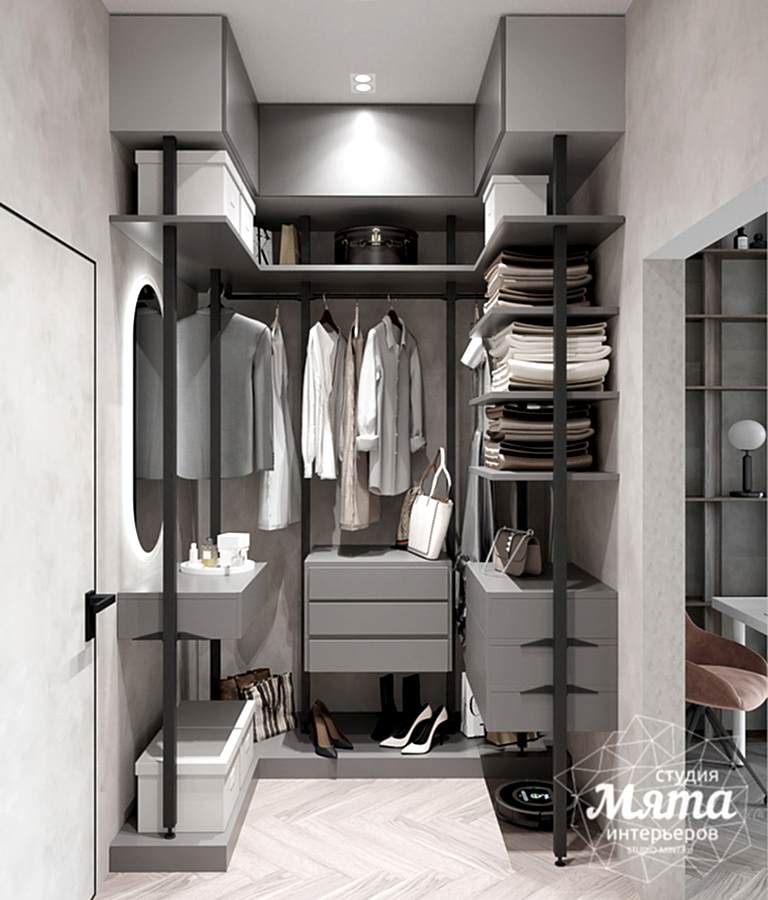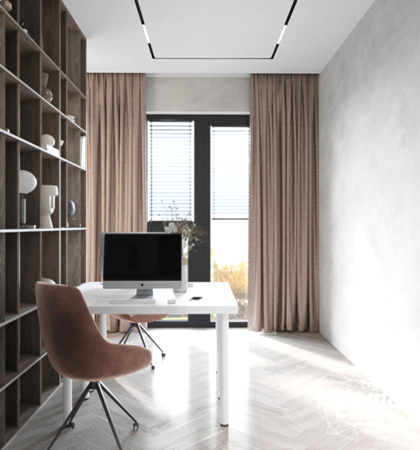 Зону спальни и кабинета разделили перегородкой, а также их зонировали разными отделочными материалами по стенам: в спальной - это покраска стен в зеленый, а в кабинете- декоративная штукатурка. Немаловажным был сценарий освещения, так как Заказчики живут по разным режимам дня. Для зоны кабинета была использована встроенная трековая система с направленными спотами и линейными светильниками, а для спальной - встроенные точечные светильники, подвесные светильники и скрытая потолочная подсветка. Необходимым было продумать вечерний сценарий освещения, поскольку один из супругов может работать в кабинете, а второй готовиться ко сну. Так, скрытая подсветка над кроватью создаст уютную вечернюю Pin-Up и не будет давать слишком много света. В гардеробной главной задачей было разместить открытую систему хранения и небольшую консоль с зеркалом, при этом предусмотреть отдельное включение освещения на данную зону, поскольку отделение гардероба от кабинета дверью не предполагалось.
