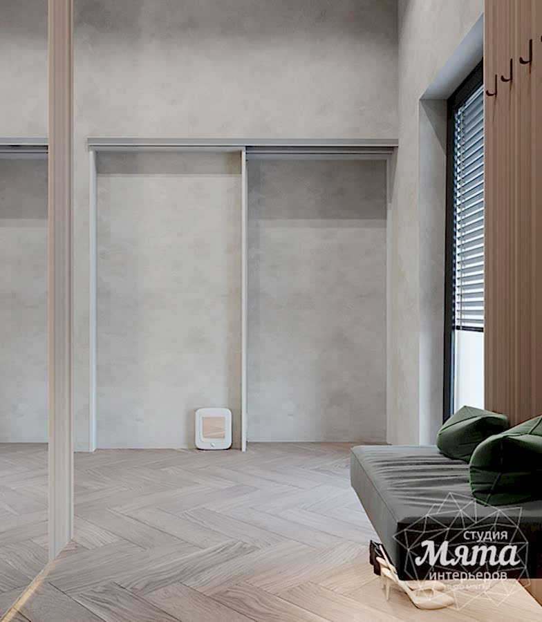 Важным было предусмотреть место для автокормушки кота в зоне кухни, а также продумать доступ кота к лотку в зоне технического помещения. Для того, чтобы визуально скрыть зону под лестницей (техническое помещение) и все коммуникации, в проект заложены раздвижные двери под декоративную штукатурку, а для доступа Pin-Up к лотку на одной из дверец выполнена фрезеровка.