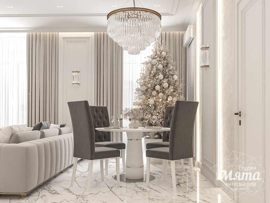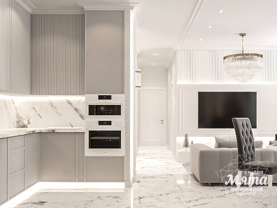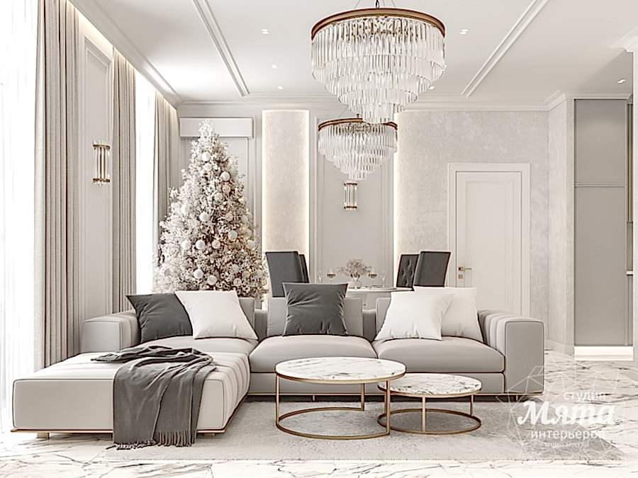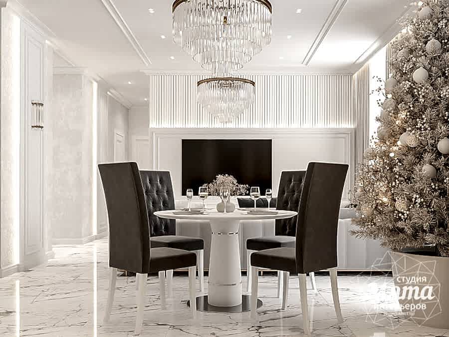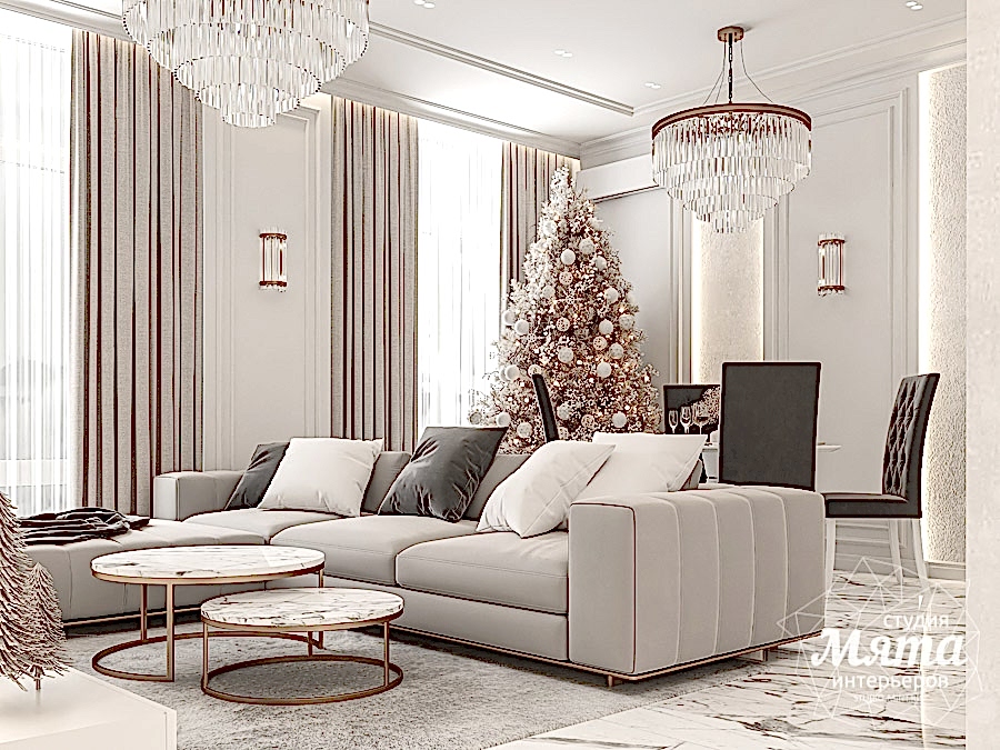 Зона кухни и гостиная зона так же были определены проектными границами помещения. Кухонный гарнитур П-образной формы уместил в себе все необходимое для комфортного хранения и удобного приготовления. В центре гостиной мы разместили большой и комфортный диван с ТВ-зоной, электрокамином и журнальными столиками. Такое расположение позволило нам выделить еще одну зону - зону столовой с круглым раскладным столом, мягкими стульями и местом для новогодней ёлки или домашнего дерева.