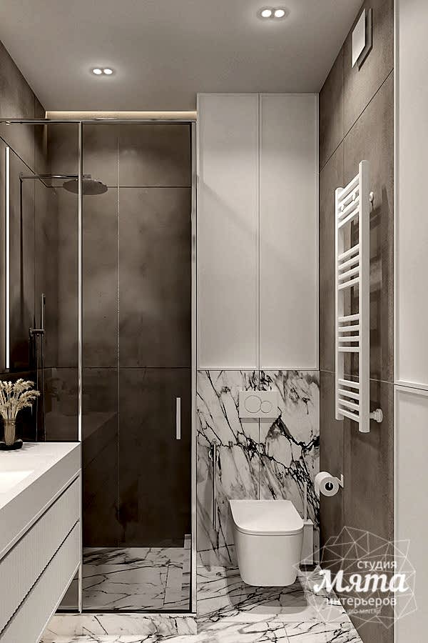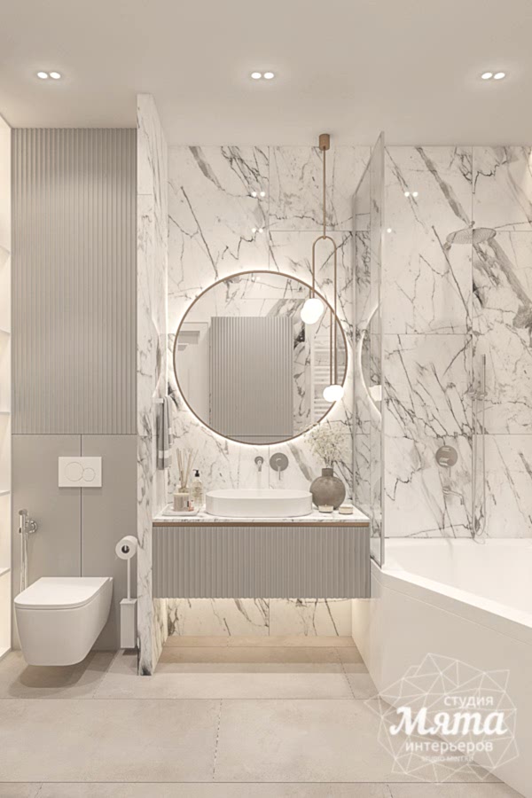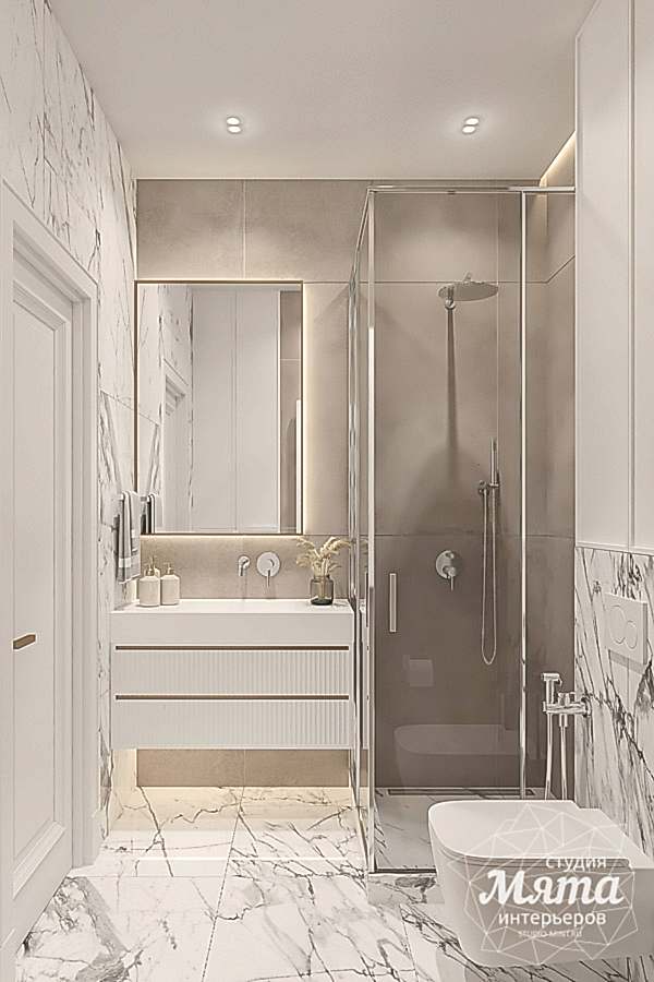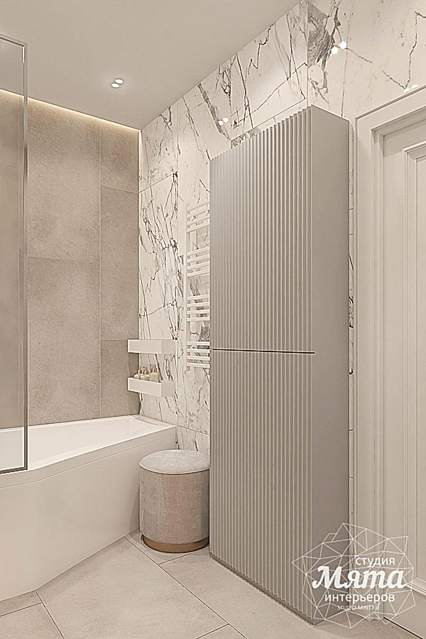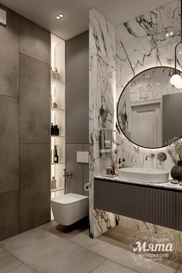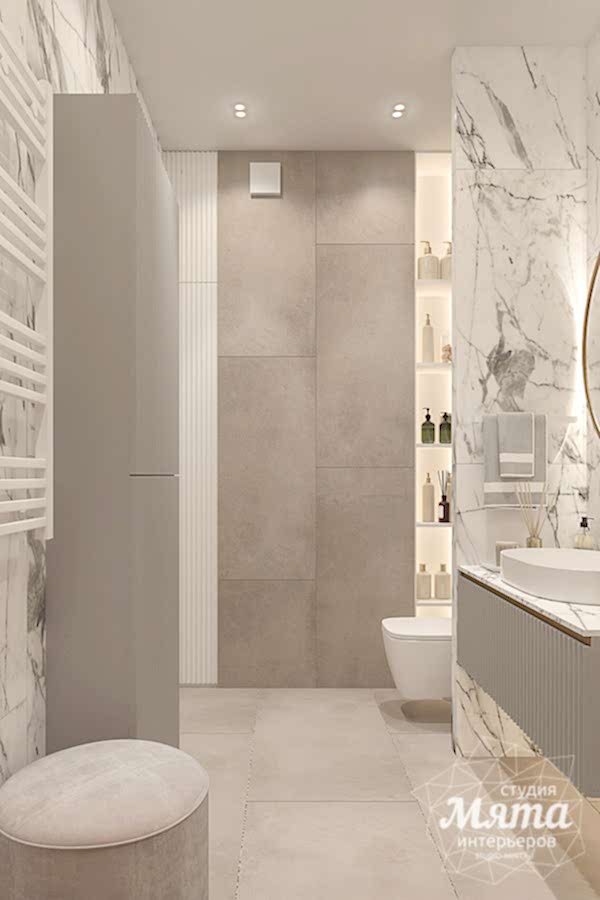 Имеющиеся санузлы функционально разделили на ванную комнату и душевую. В них мы разместили все необходимое оборудование и достаточное количество мест для хранения, что было важно для Заказчиков. В отделке использовали керамогранит под Pin-Up в сочетании с бежевым керамогранитом с текстурой замши, что поддерживает общее цветовое и стилистическое направление квартиры. К основному освещению добавили различные скрытые подсветки потолочных ниш, мебели и зеркал.